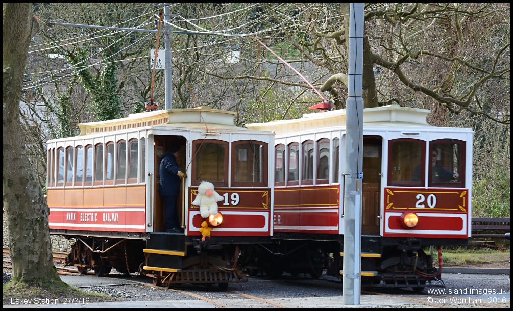 MER Car No 19 departing for Douglas as Car No 20 enters the station