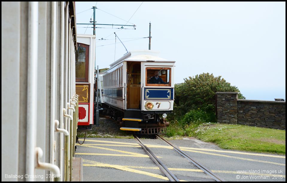 Passing Car No 7 on the Ballabeg road crossing. MER rules require that if two cars are going to pass adjacent to a level crossing, the first car halts across the roadway until the other is passing