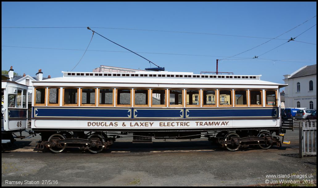 A side on view of blue liveried Douglas & Laxey Electric Tramway Car No 7, one of six new cars (4 - 9) delivered to the railway in 1894 for the opening of the line to Laxey and establishment of a year round service.