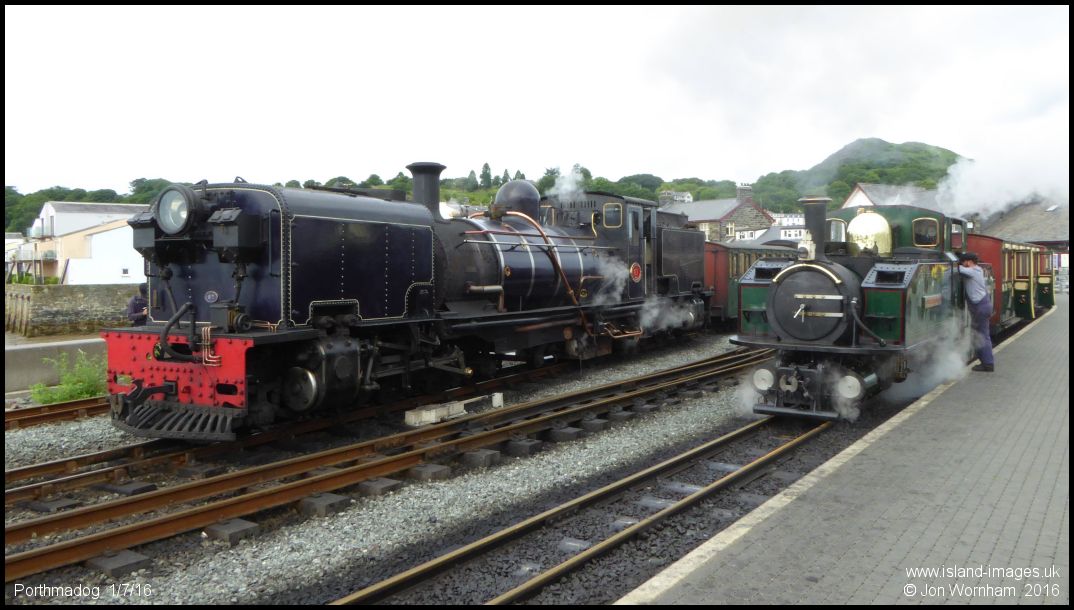 Welsh Highland Railway 2-6-2+2-6-2 Garrett No 87 and Ffestiniog Railway 0-4-4-0T 'Iarll Merionydd' in Porthmadog Station