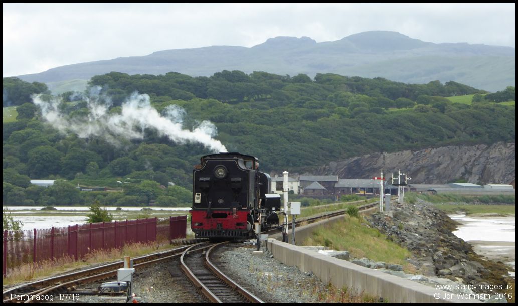 No 87 runs onto the Cob again, before running round to the front of the WHR Caernarfon train