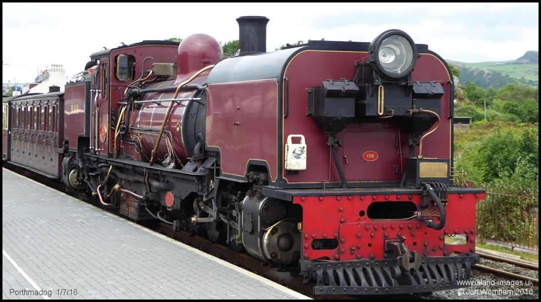 Welsh Highland Railway 2-6-2+2-6-2 Garrett No 138 stands at Porthmadog after arriving from Caernarfon