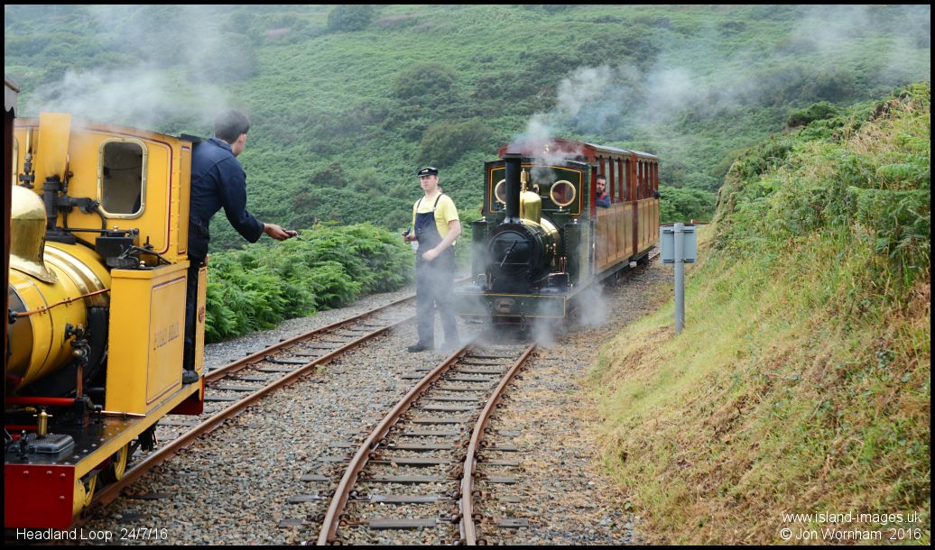 On the train back to Lhen Coan, with the footplate crews of 'Polar Bear' and 'Sea Lion' about to exchange single line tokens at the Headland Loop