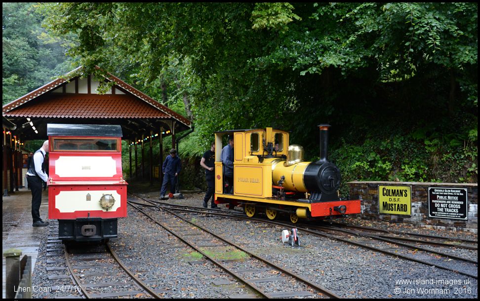 The two 'Polar Bears' at Lhen Coan station. The battery electric 'Polar Bear' is a replica, constructed in 2003, of 2 such locomotives delivered in 1921 but scrapped in the late 1920s.