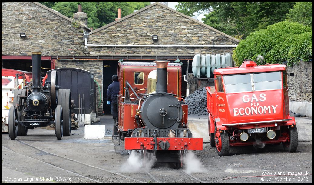 Flanked by a Steam lorry and traction engine, 'Fenella' heads to the sheds for coal and water
