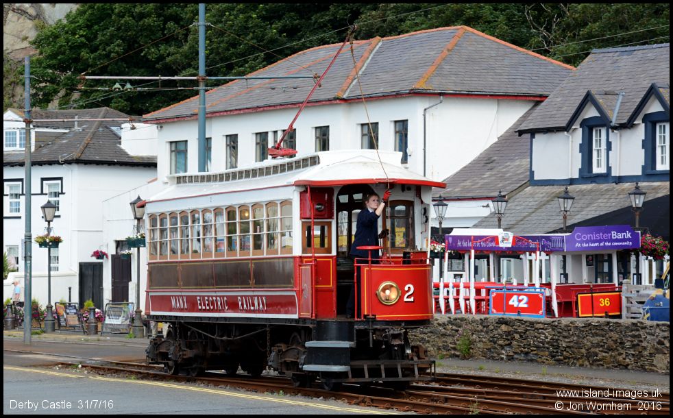 Manx Electric Railway car No 2 shunts at the Douglas terminus of the line. One of two survivors of the three motor cars delivered for the line's opening to Groudle in 1893