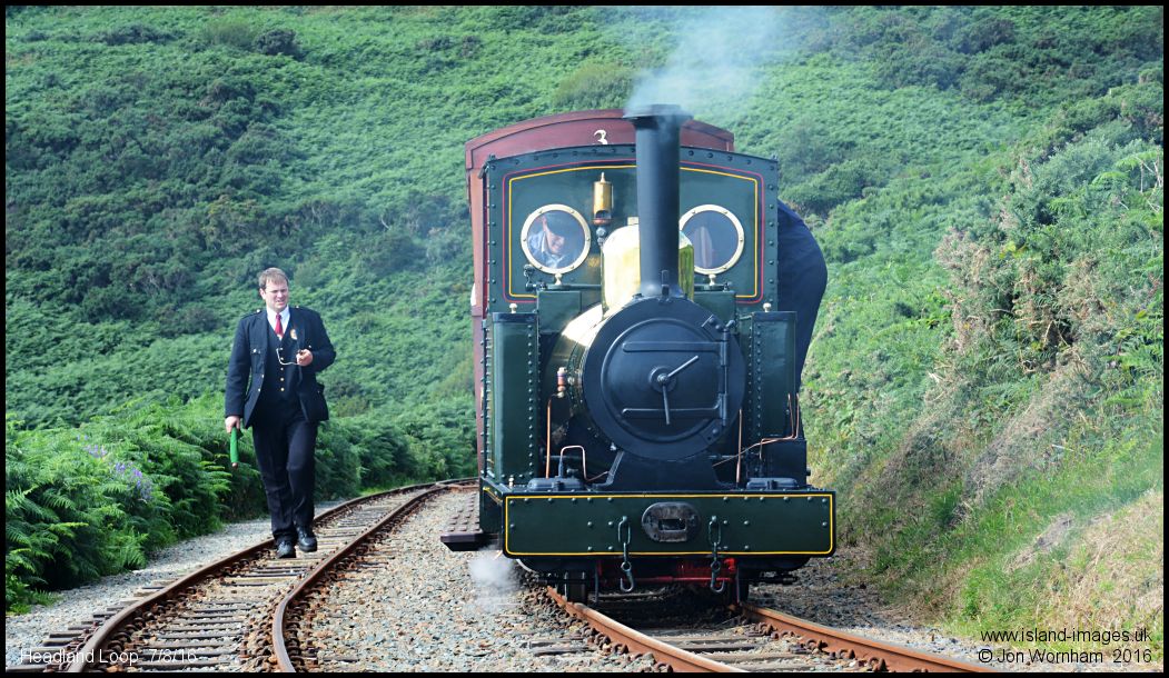 'Sea Lion' waits in the Headland Loop, while the guard walks to call the other train onwards
