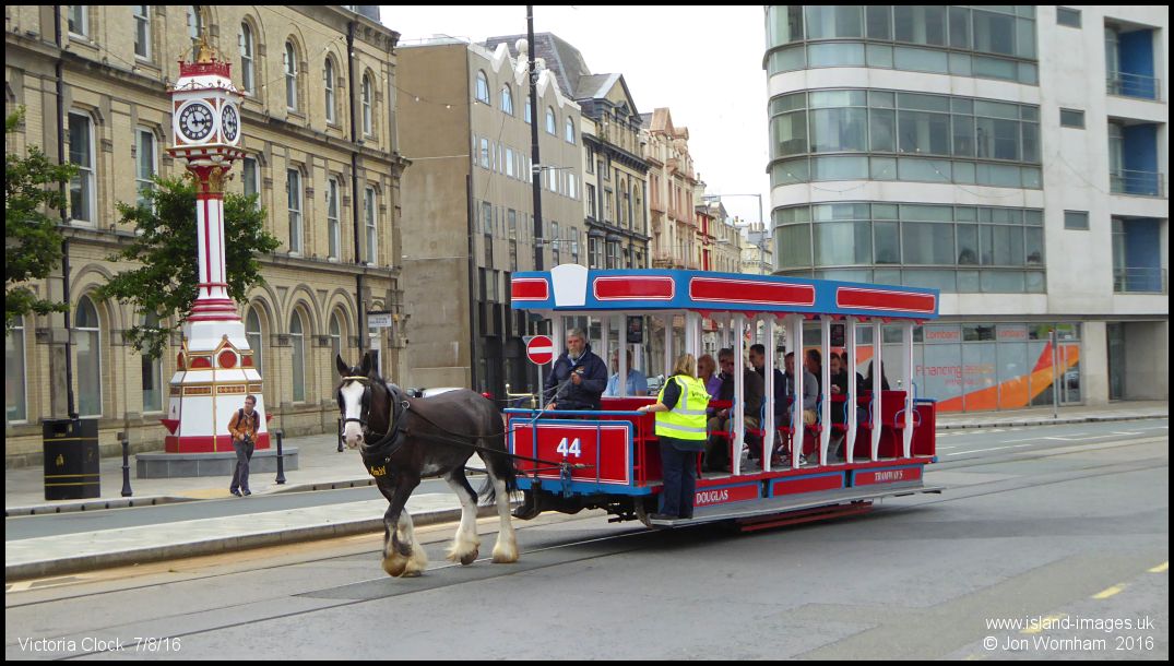 'Amby' with tram No 44 passes the Victoria Clock in Douglas
