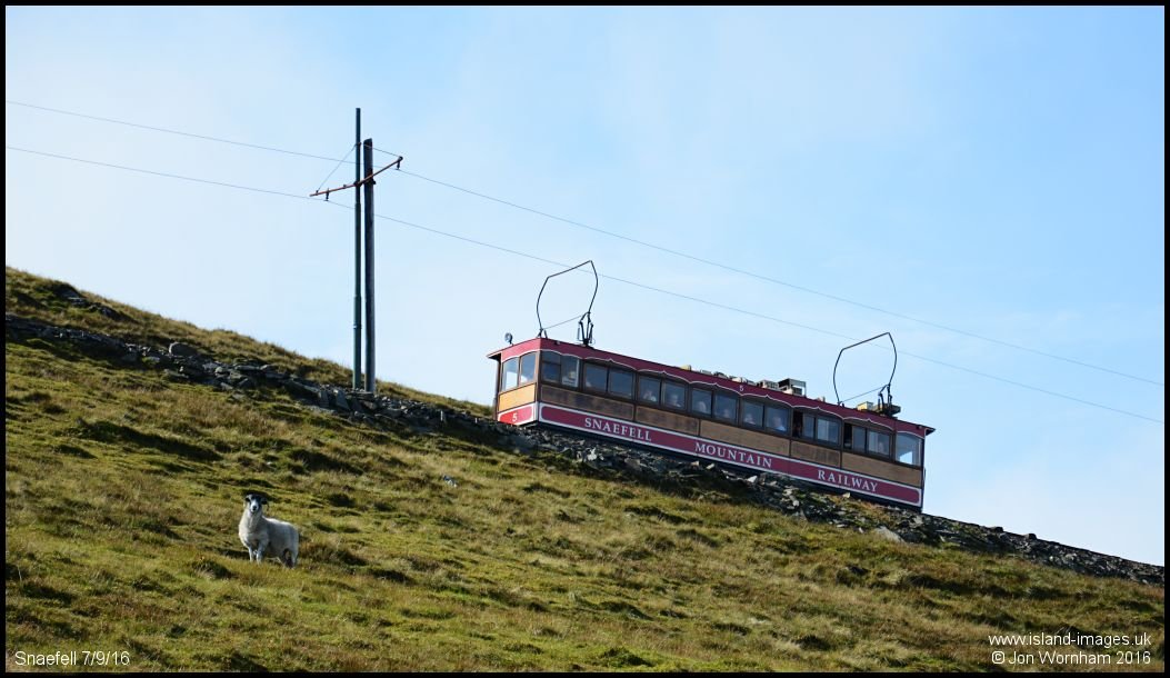 Snaefell Mountain Raway Car No 5 climbs around the northern shoulder of the mountain