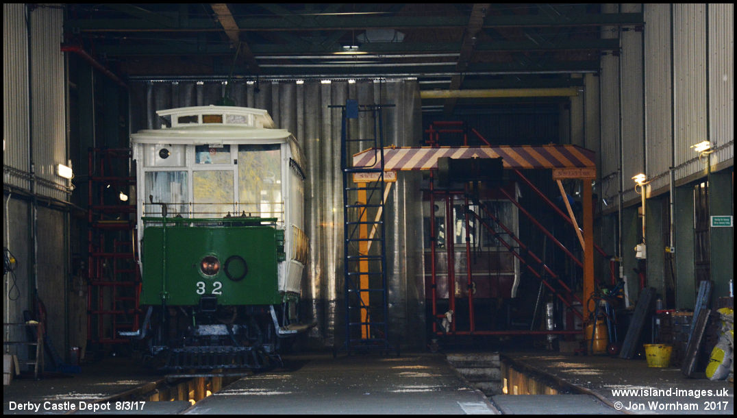Newly repainted into green livery, crossbench Car No 32 hides deep inside the depot building