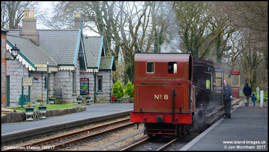 'Fenella' awaits the arrival of the train from Douglas at the attractive Casletown Station