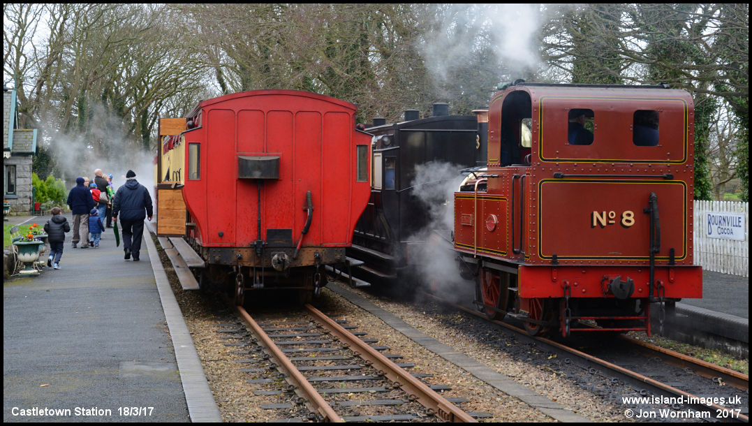 Trains passing at Castletown Station. The main line line is all single track, but there are five passing loops available between Douglas and Port Erin
