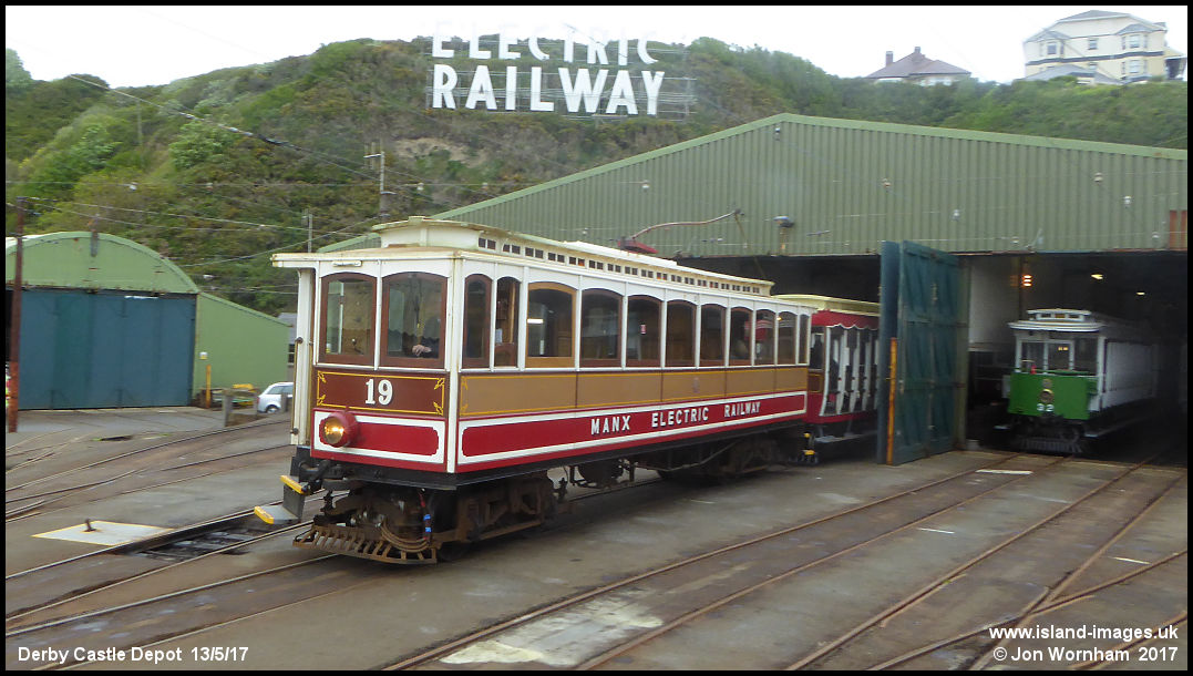 Car No 19 hauls a trailer out of the shed