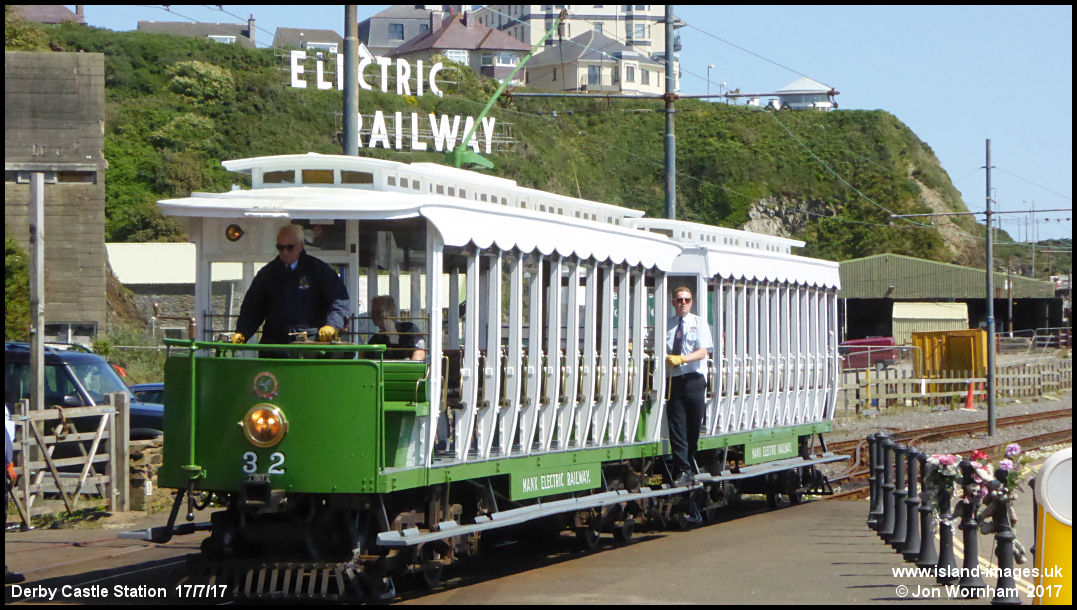 Repainted this year into 'Nationalisation Green', open crossbench Car No 32 enters Derby Castle station. Together with No 33, they were the last new cars for the line, delivered in 1906