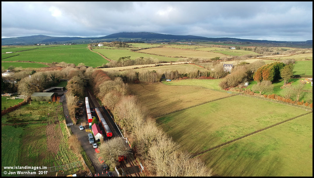 Aerial view of Santon Station with 'Fenella' hiding under a tree!