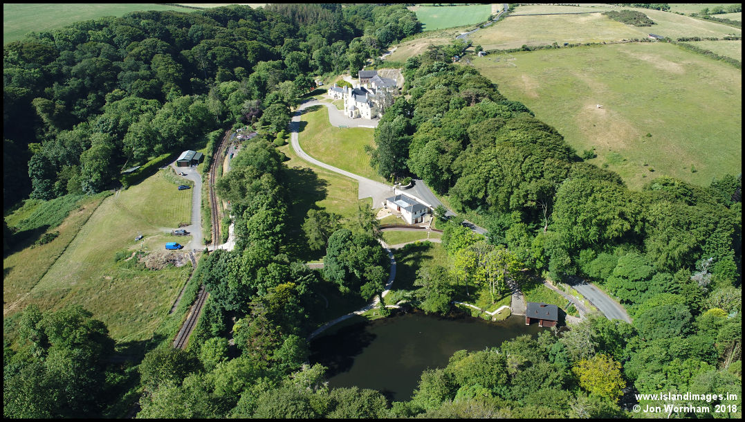 Crogga House and grounds. The Crogga Glen Railway is largly hidden by the trees in this picture, but the 3' gauge Isle of Man Railway can be seen running through the grounds.