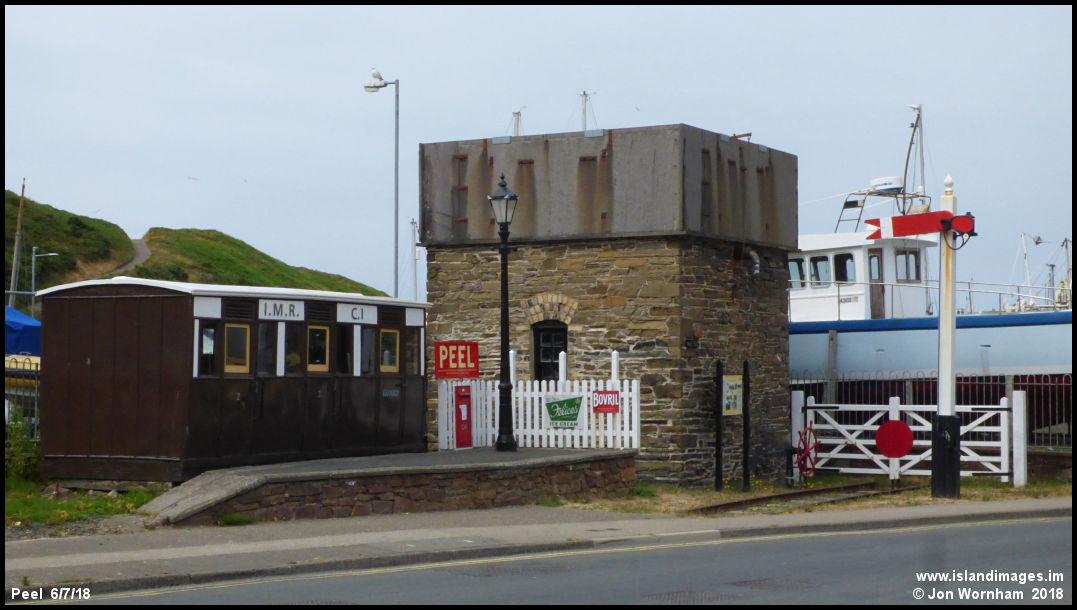 The small display of railway artifacts where the line used to enter Peel station, including the body from 4 wheel coach C1.