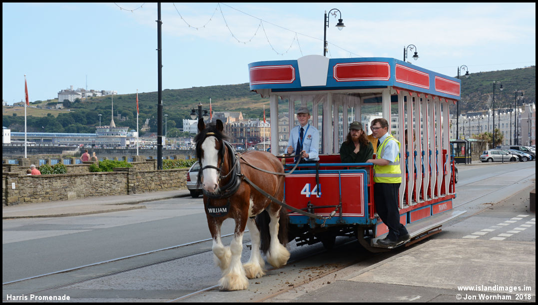 Tram No 44 and the 'Williams' on Harris Promenade with the Sea Terminal visible behind.
