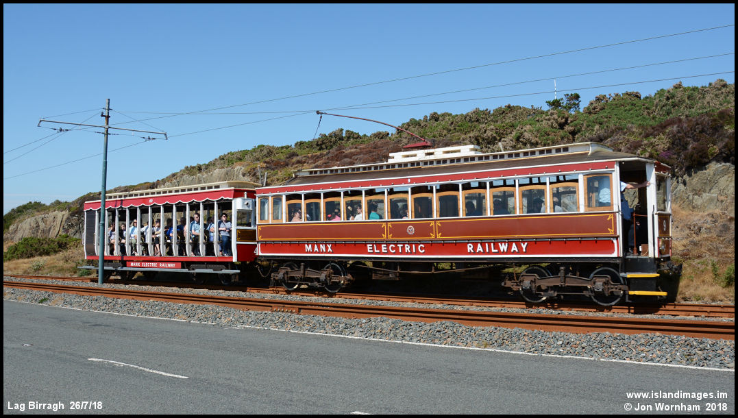 Illuminated Car No 9, pared with trailer No 40. This trailer was delivered in 1930 to replace the original of that number, destroyed in the Laxey Depot fire.