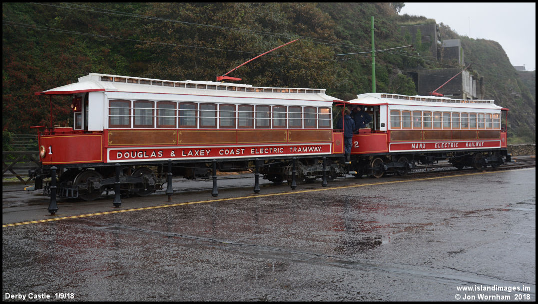 Delivered with No 3 and six trailers for the opening of the line in 1893, MER Cars No 1 & 2 stand in the rain at Derby Castle.
