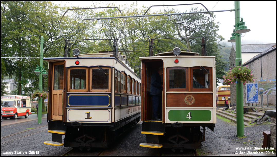Blue and green liveried Snaefell Cars 1 & 4 stand together in Laxey Station