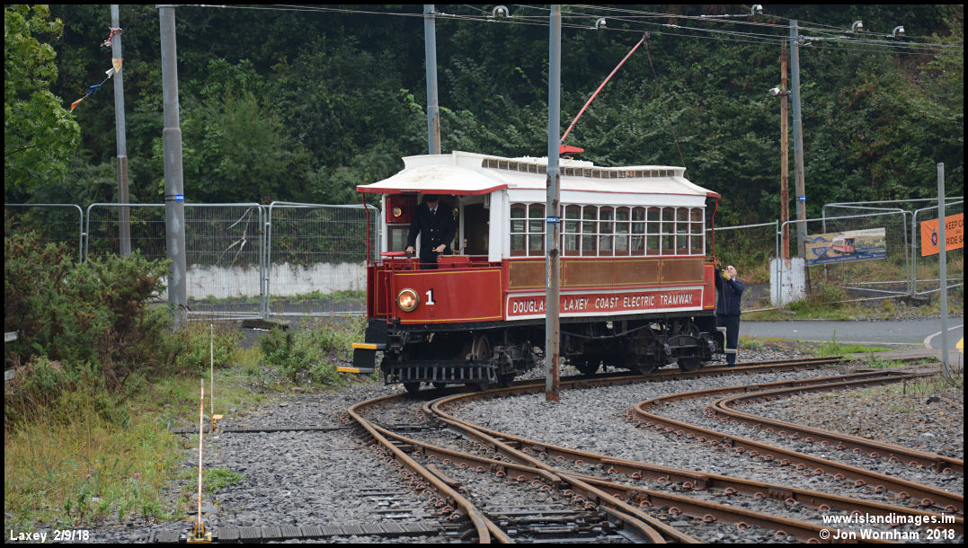 MER Car No 1 prepares to switch tracks outside Laxey station, operating a shuttle sevice from the station to the Laxey car sheds, where organised tours were available.