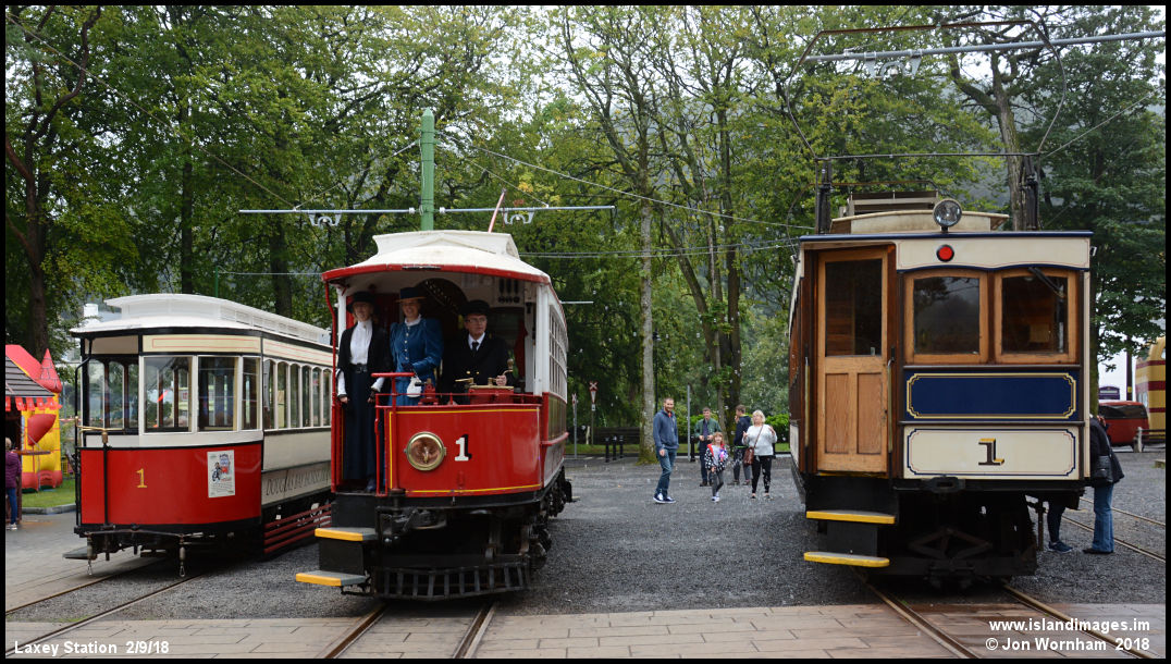 Three 'Number 1' tramcars lined up in Laxey Station.