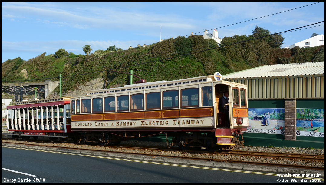 'Douglas Laxey & Ramsey Electric Tramway' No 19 passed the Derby Castle depot heading northound on a sunny morning.