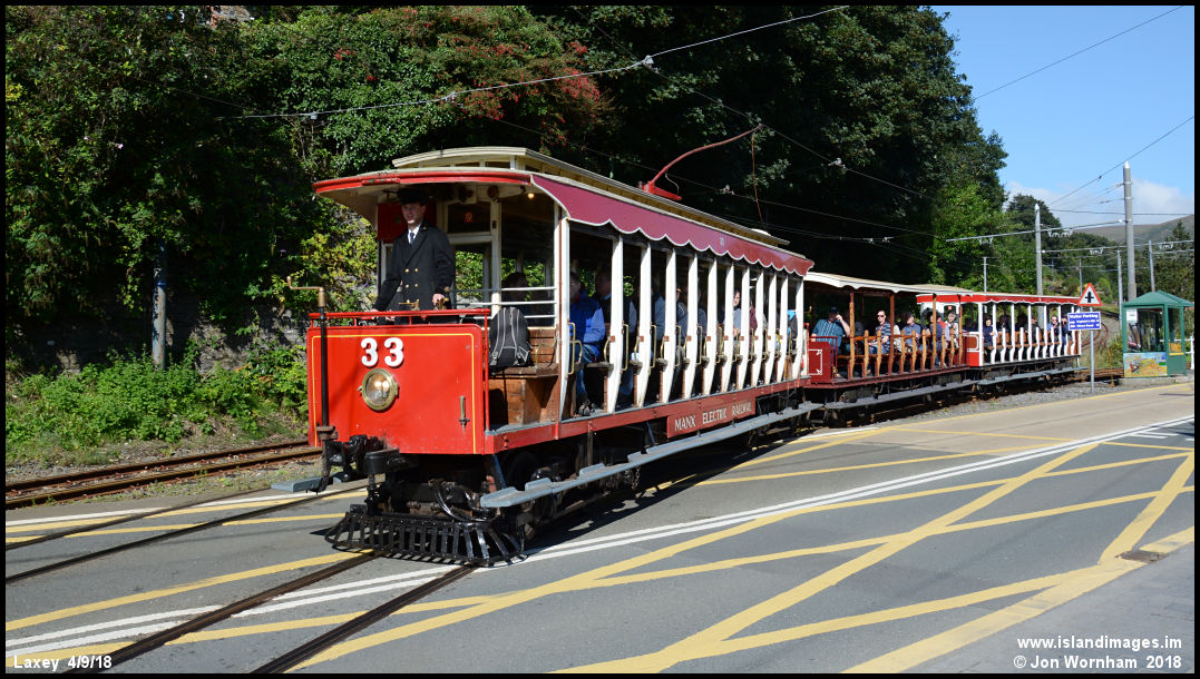 The special working at Laxey, with No 33 leading the two trailers across the main road before entering the station area.