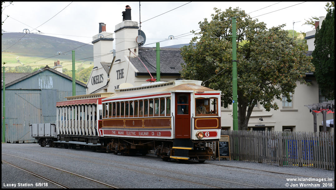 Car No 6 arriving at Laxey from the Ramsey direction with open wagon No 8 behind the trailer.