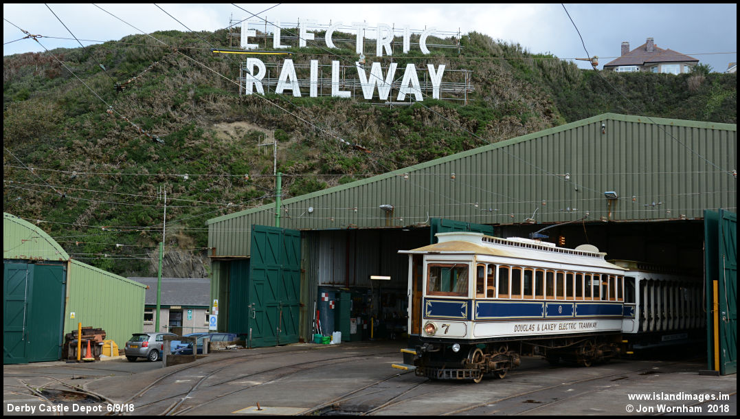 Blue liveried Car No 7 stands outside the Derby Castle depot.