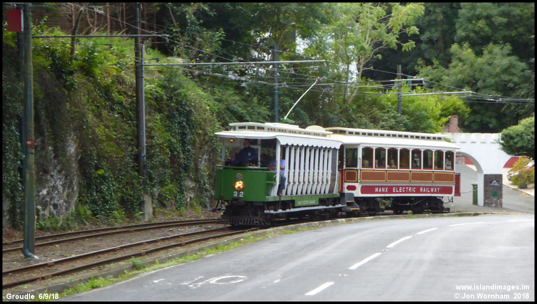 Open crossbench Car No 33 approaches Groudle station with saloon trailer No 57.