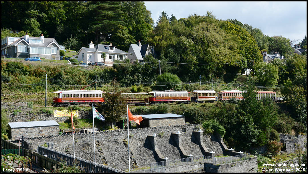 Trams starting to line up for the 125th Anniversay Cavalcade through Laxey Station