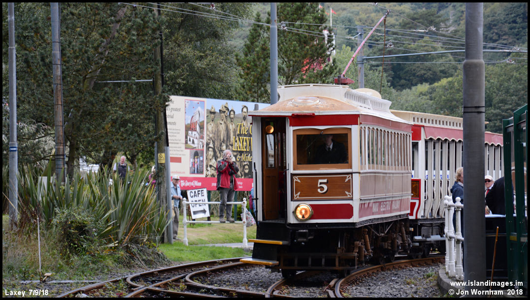 Car No 5 approaches, one of a batch of six delivered in 1894 for the extension of the line from Groudle to Laxey and the commencement of year round services.