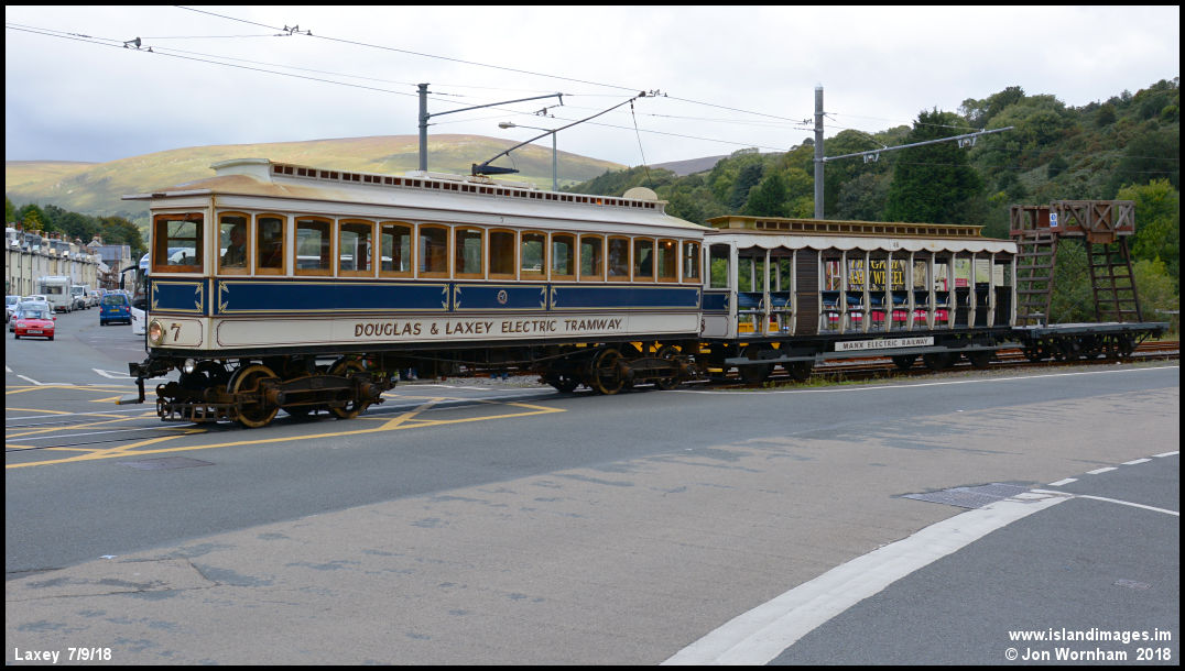 Blue liveried Car No 7 is next in line, paired with matching trailer No 48 and one of the tower wagons used to service the overhead power lines. No 48 was delivered in 1899 for the opening of the line form Laxey to Ramsey.