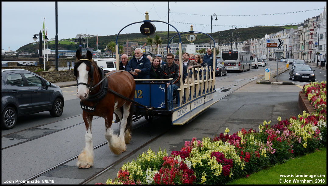 Car No 12 and William passing by the gardens outside the Sefton Hotel and Gaiety Theatre. This whole area is due to be re-developed shortly and the tramway will be single track on the sea side of the road from here to the Sea Terminal.
