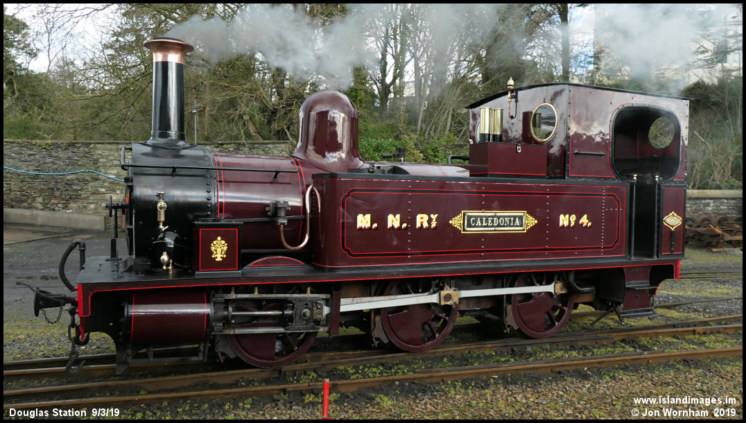 A side on view of the immaculate 'Caledonia', built in Glasgow in 1885 to operate the steeply graded Foxdale branch line of the Manx Northern Railway.