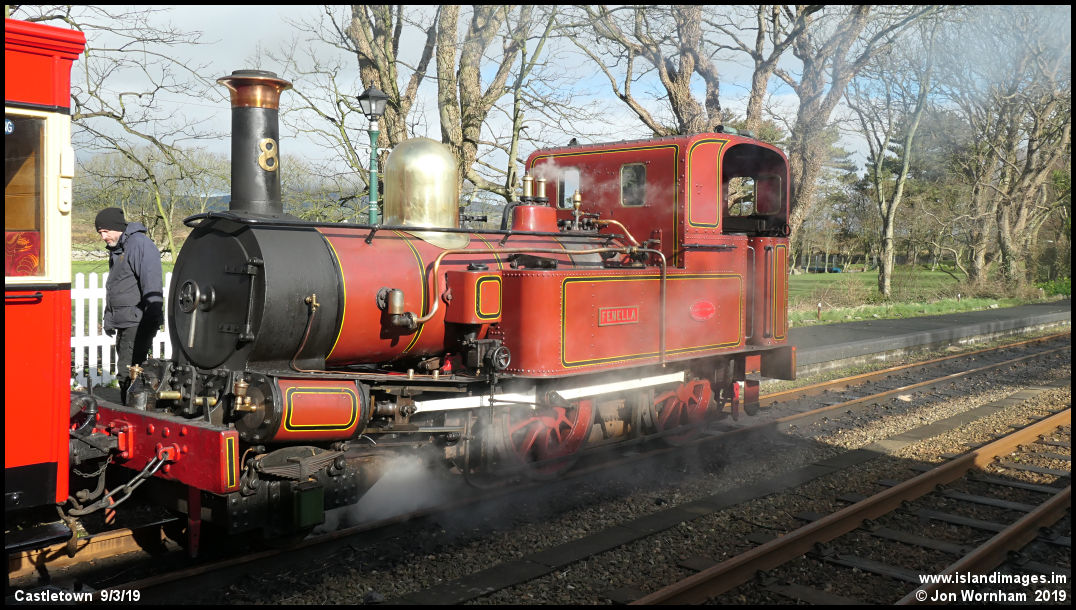 'Fenella' stands in Castletown Station, awaiting the arrival of the train from Douglas. The single line tokens will then be exchanged allowing the trains to proceed.