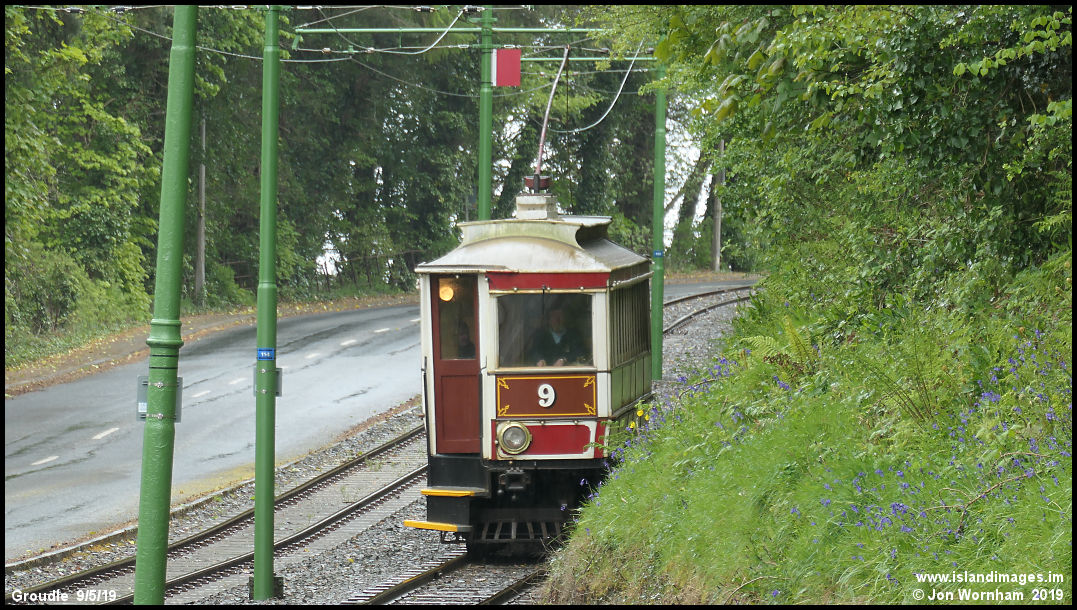 Manx Electric Railway Car No 9 approaches Groudle on a damp afternoon.