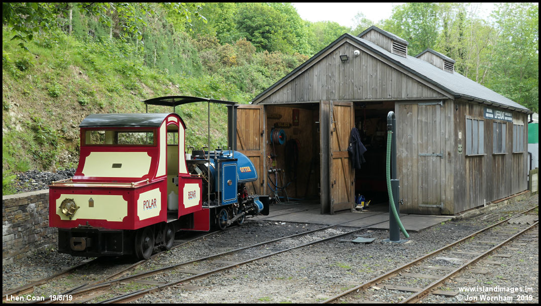 Groudle Glen Railway locos 'Polar Bear' and 'Otter' outside the engine shed at Lhen Coan