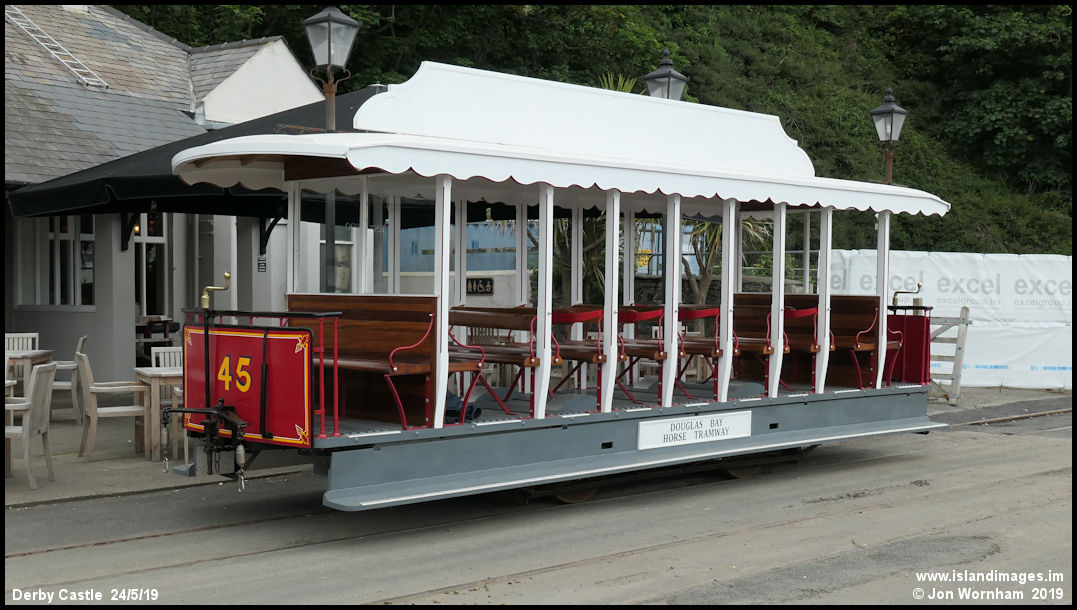 Today was the first 2019 operating day for the Douglas Bay Horse Tramway, delayed due to the promenade reconstruction works. Tram No 45 is outside The Terminus tavern.