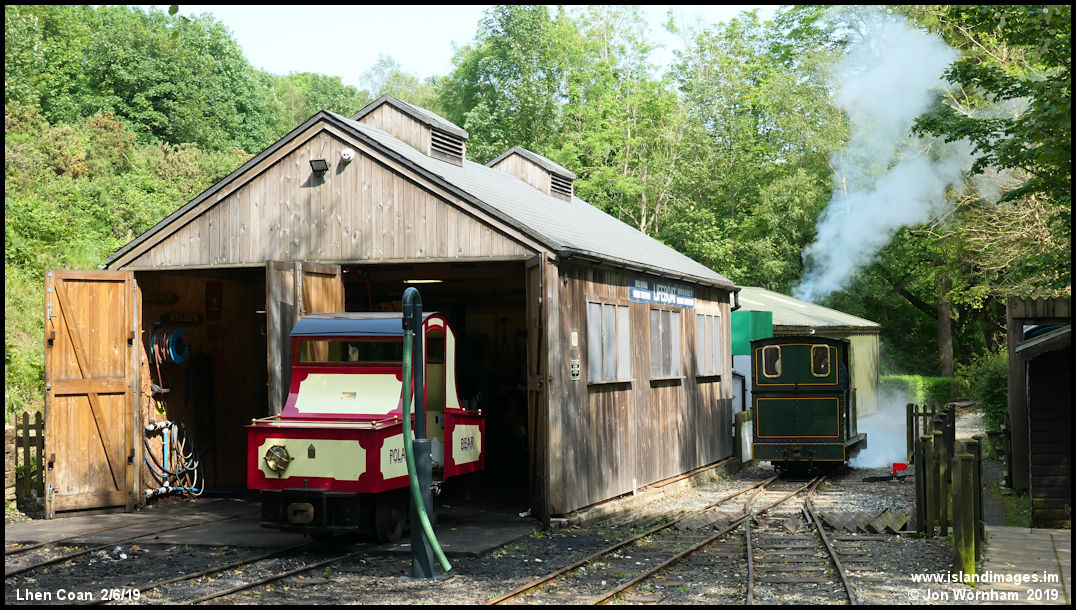 'Sea Lion' shunts at Lhen Coan, while battery electric 'Polar Bear' stands outside the engine shed.
