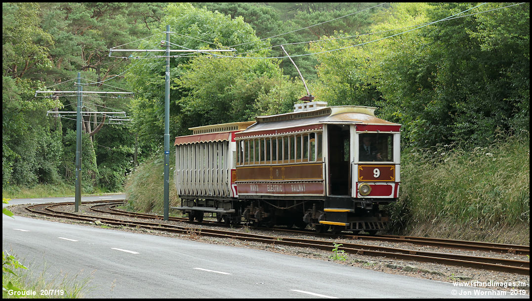 Illuminated Car No 9 runs northbuond alongside the Groudle Road.