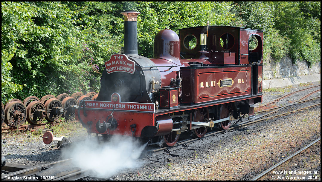 'Caledonia' is wearing special headboards to commenerate the 140th anniversary of the opening of the Manx Northern Railway from St John's to Ramsey.