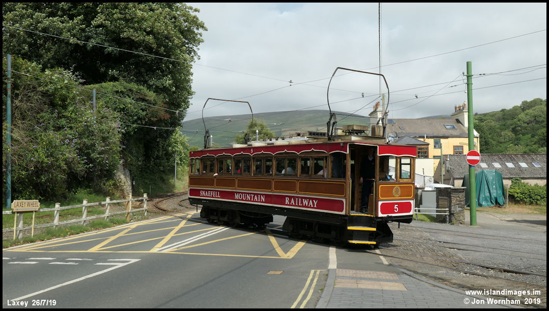 Snaefell Car No 5 crossing the main road in Laxey, heading for the summit.