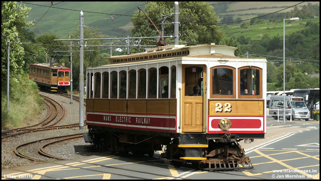 As Snaefell Car No 5 starts the climb, MER Car No 22 is crossing the main road into Laxey station. Note that Snaefell cars run on the right hand rail, whereas MER cars run on the more conventional left rail.