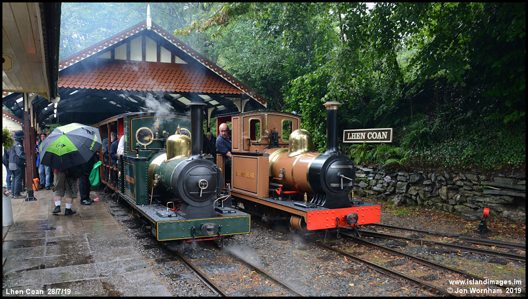 Lhen Coan station on the Groudle Glen Railway, just after the official launch of new build 'Brown Bear' into service. The weather was not kind, with heavy rain falling.