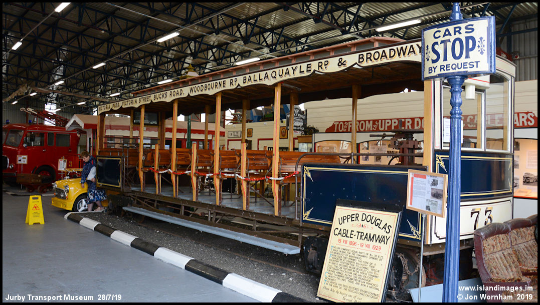 The 'Car No 73' end of the preserved Upper Douglas Cable Tramway car. It was reconstructed from two cars that had been converted into a house. The tramway closed in 1929.