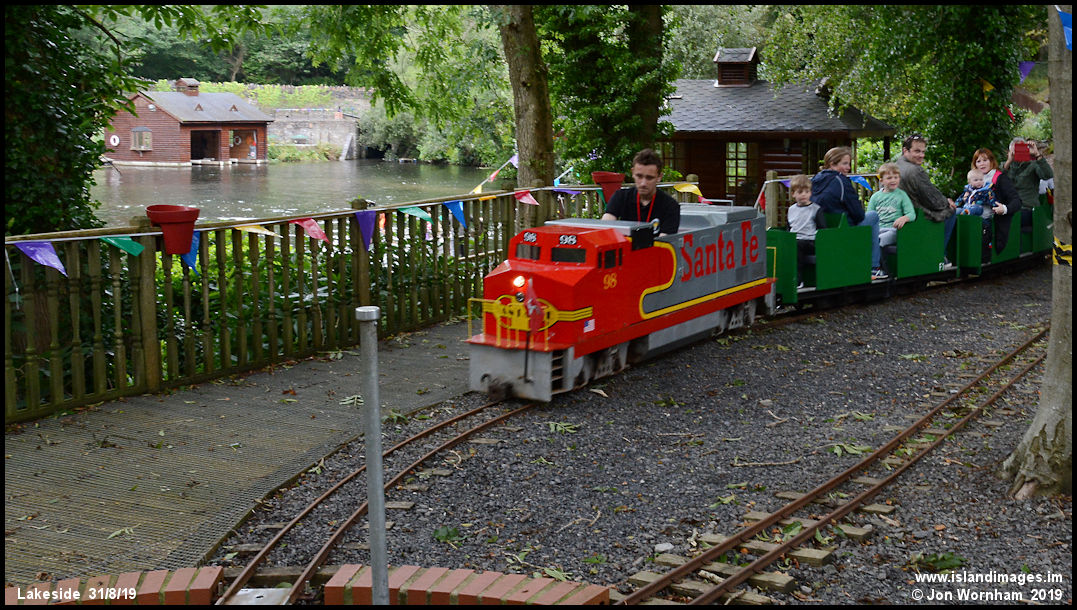 'Santa Fe' arriving at Lakeside station with the lake visible behind. Passengers will be offered boat trips before returning on the train to Crogga Heights.