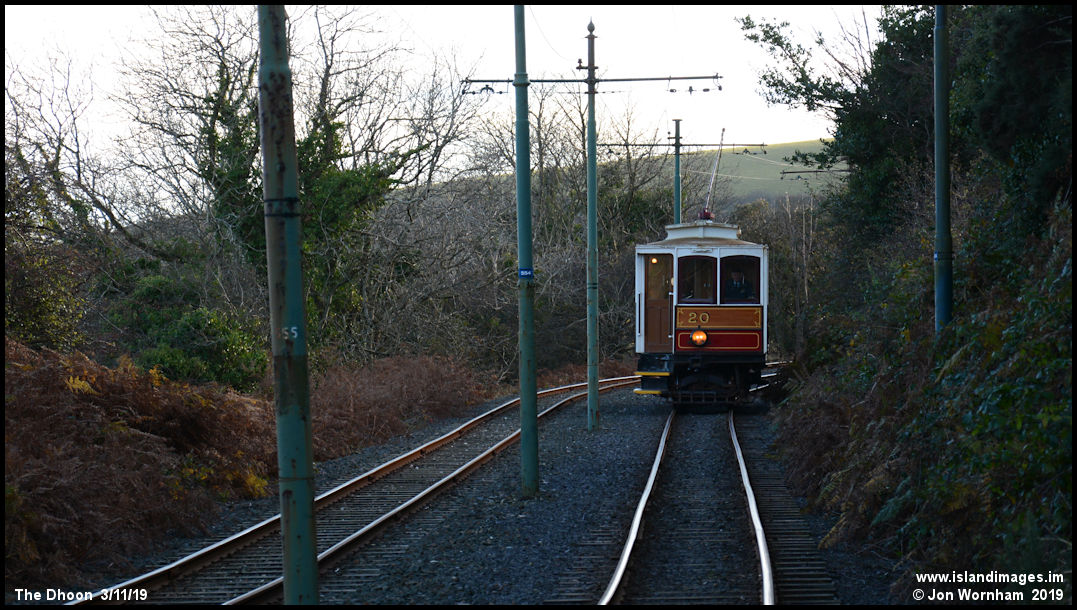 Car No 20 runs down towards The Dhoon from the Laxey direction.